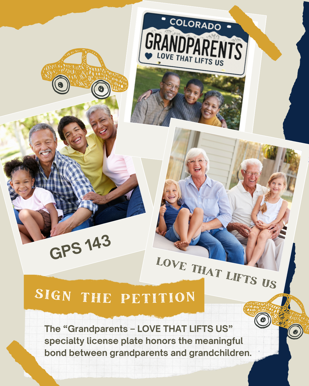 WDC is leading a statewide effort to create a Colorado specialty license plate honoring grandparents and kinship caregivers who are raising grandchildren or struggling to maintain visitation during family conflict. Many caregivers face the dual burden of limited legal support and unexpected expenses while providing stability for children.